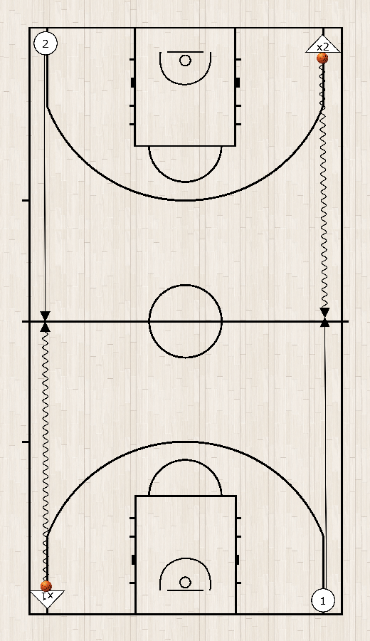1 CONTRO 1 I difensori nella fila di sinistra palleggiano fino a metà campo, poggiano la palla sulla linea e tornando in difesa nella stessa metà. Gli attaccanti corrono di fronte fino a metà campo, raccolgono la palla e giocano 1 c 1. Giocano fino al primo tentativo di tiro (rimbalzo). Un canestro realizzato e un rimbalzo offensivo valgono un punto.