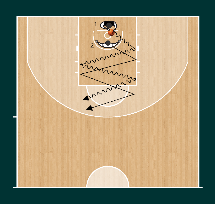 Il gioco prosegue con 1 che cede la palla a 2 e difende: 2 parte in posizione centrale sulla linea dei tre punti e avrà a disposizione un palleggio per ogni cambio di direzione che sarà riuscito a far eseguire al suo avversario: nel nostro caso 1 avrà 3 palleggi per attaccare il canestro.