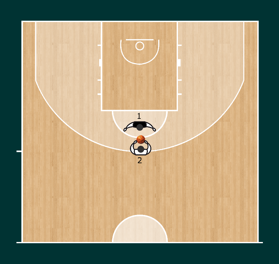 Giocatore 1 con la palla sotto canestro, giocatore 2 di fronte a lui pronto a difendere.