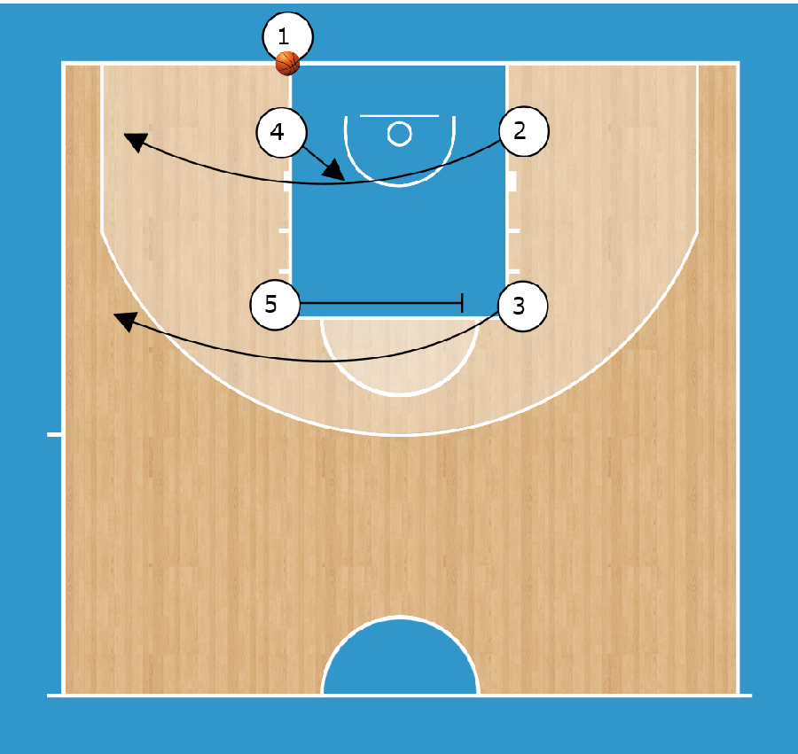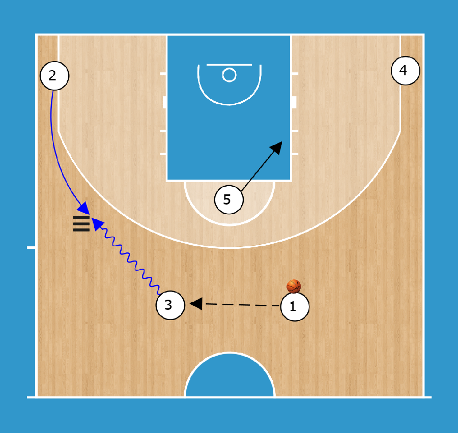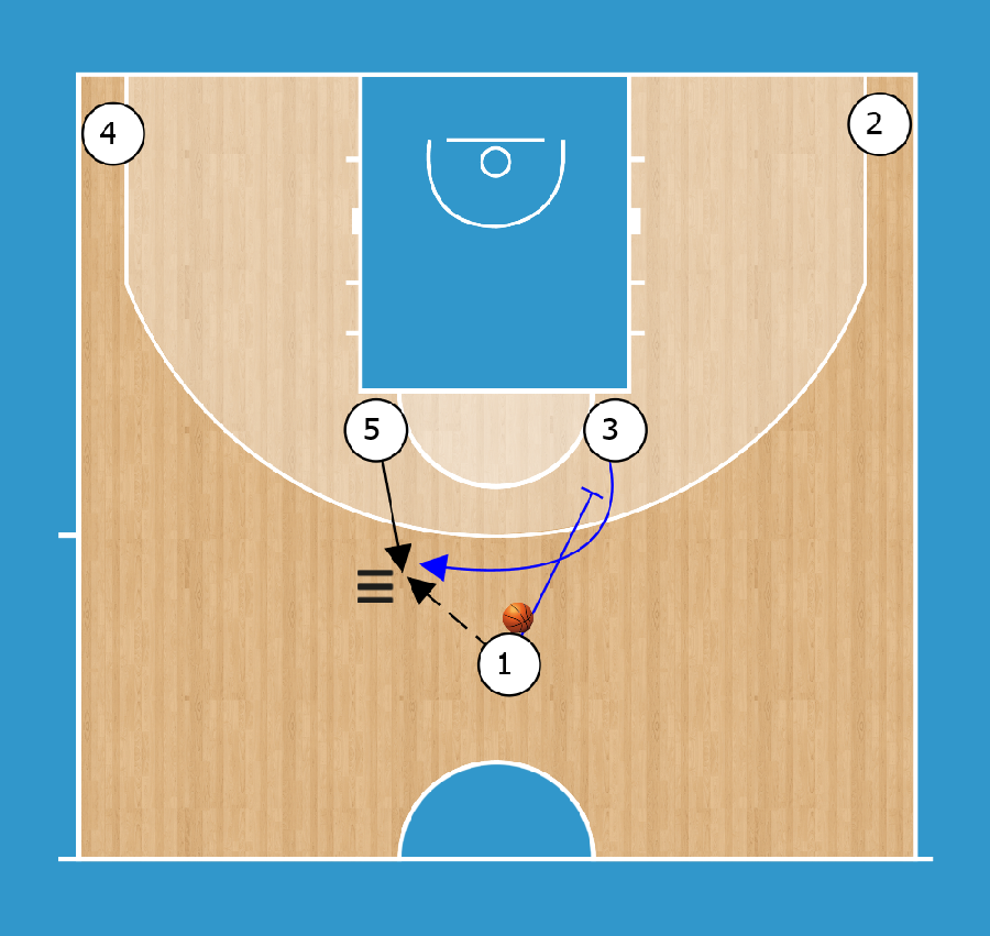 HORNS SCREEN AWAY HAND-OFF 1 passa a 5 e blocca 3. 3 esce dal blocco e gioca DHO con 5.