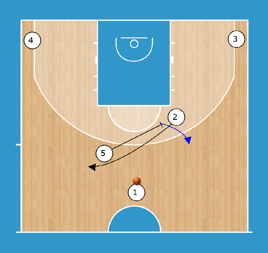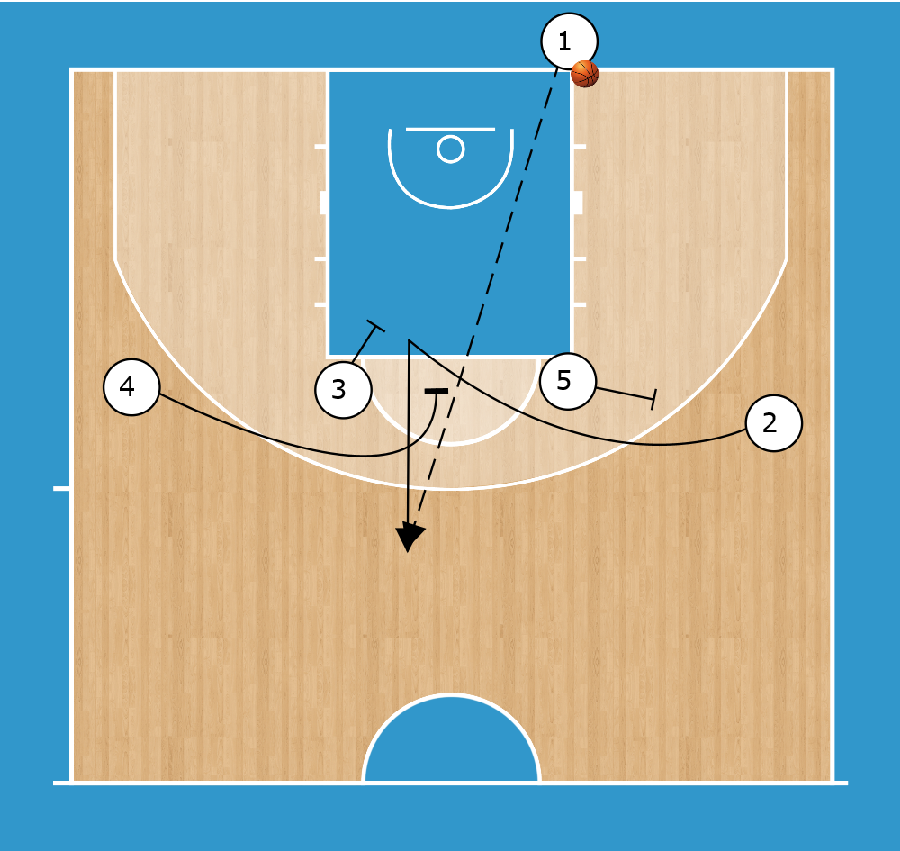 4 High BLOB 5 blocca per 2. mentre 4 taglia sulla linea del tiro libero. 2 sfrutta il blocco di 3 e di 4 per uscire in punta e ricevere.
