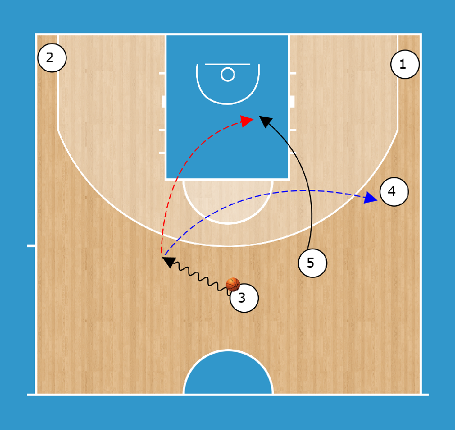 Qui invece il post è un giocatore veloce e atletico. Blocca e incrocia il passo più alto verso canestro ed esegue uno sprint al ferro. Gira la testa per trovare subito la palla. Non ci sono giri dorsali. Molte squadre usano questo tipo di blocco sulla palla. È veloce e facile da insegnare, molto più del dorsale tradizionale nel Pick&Roll.