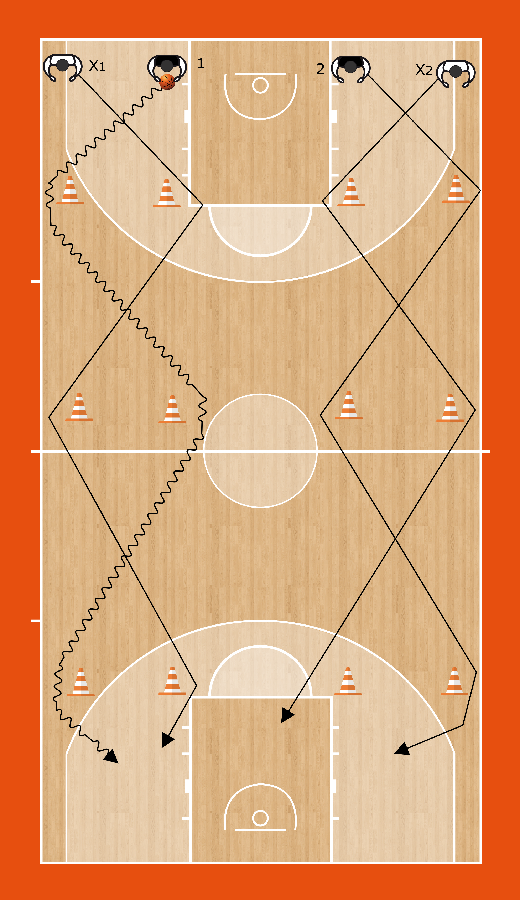 Descrizione: 1 apre il palleggio ed esegue uno slalom diagonale tra i birilli; contemporaneamente anche 2, X1 e X2 eseguono analogo persorso senza palla. Al termine dello slalom: 1 attacca il canestro, con l’aiuto di 2 se necessario. X1 e X2 cercano di recuperare la corretta posizione difensiva.