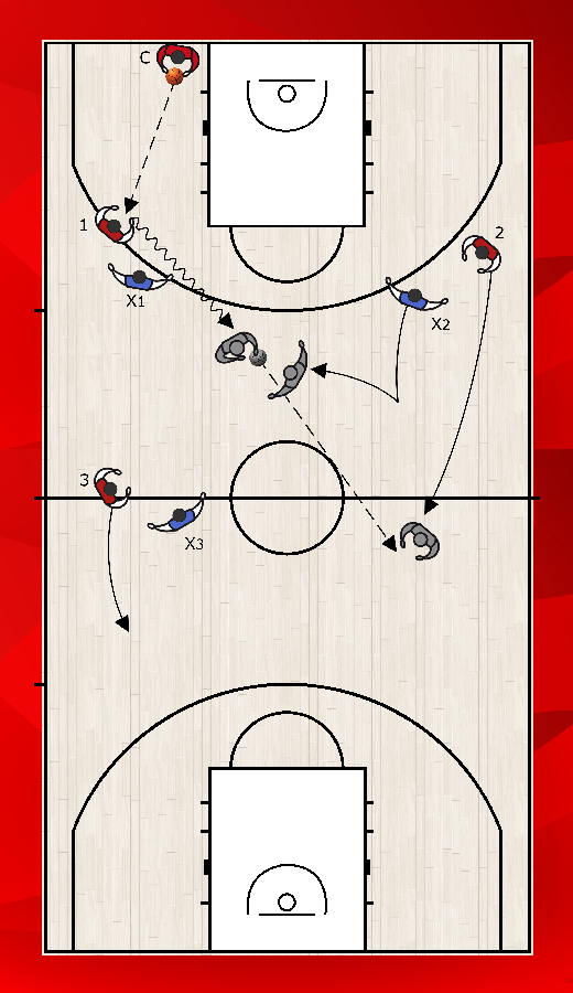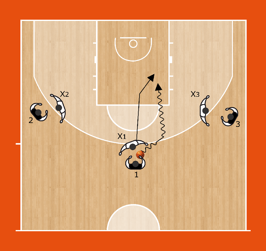 Un esercizio di 3 contro 3 con ricezione libera è utile per insegnare al playmaker a battere in palleggio il difensore per creare sovrannumero. Diciamo a X2 o X3 di aiutare perché il playmaker sappia selezionare quale passaggio fare al compagno libero.