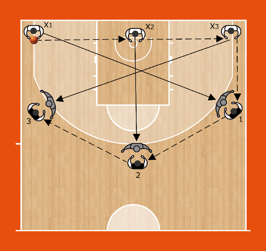 Descrizione: X1 passa a X2 e sprinta per difendere su 1, X2 passa a X3 e corre a difendere su 2, X3 passa a 1 e corre a difender su X3. 1 passa a 2, 2 a 3 per completare il ribaltamento.