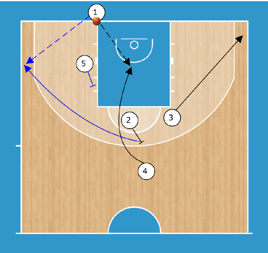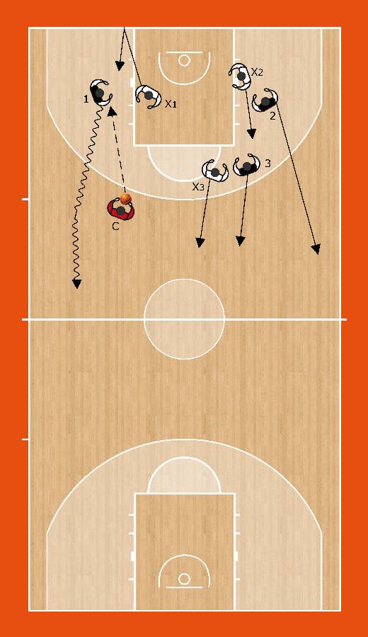 Descrizione: il coach passa la palla ad uno dei giocatori a sua scelta. Appena in possesso di palla, la squadra del ricevitore attacca il canestro opposto, mentre il marcatore diretto del ricevitore va a toccare la linea di fondo prima di poter recuperare in difesa.