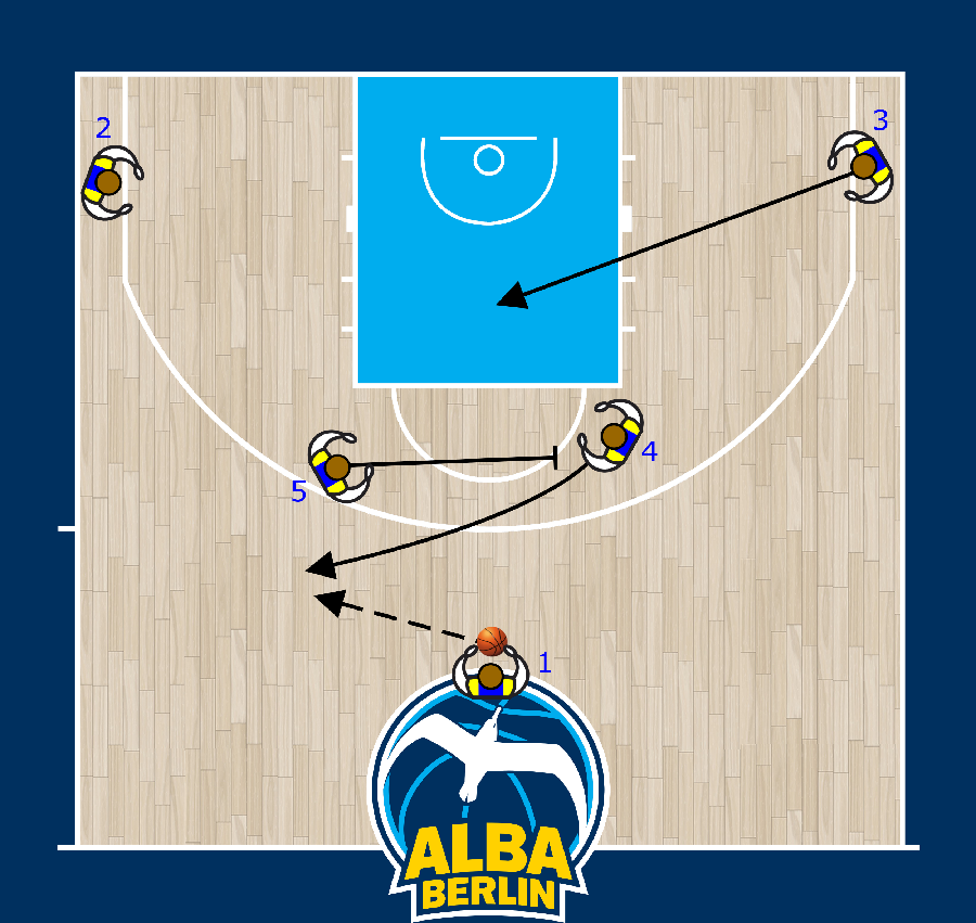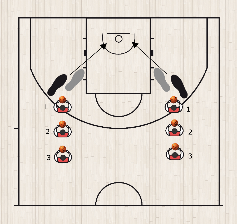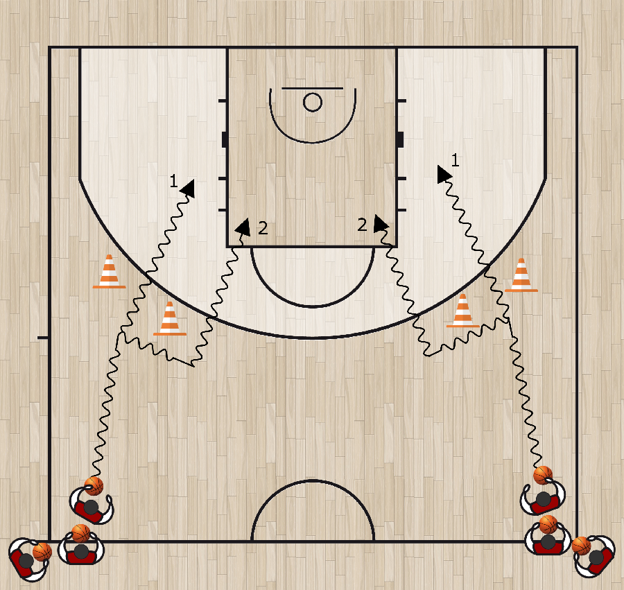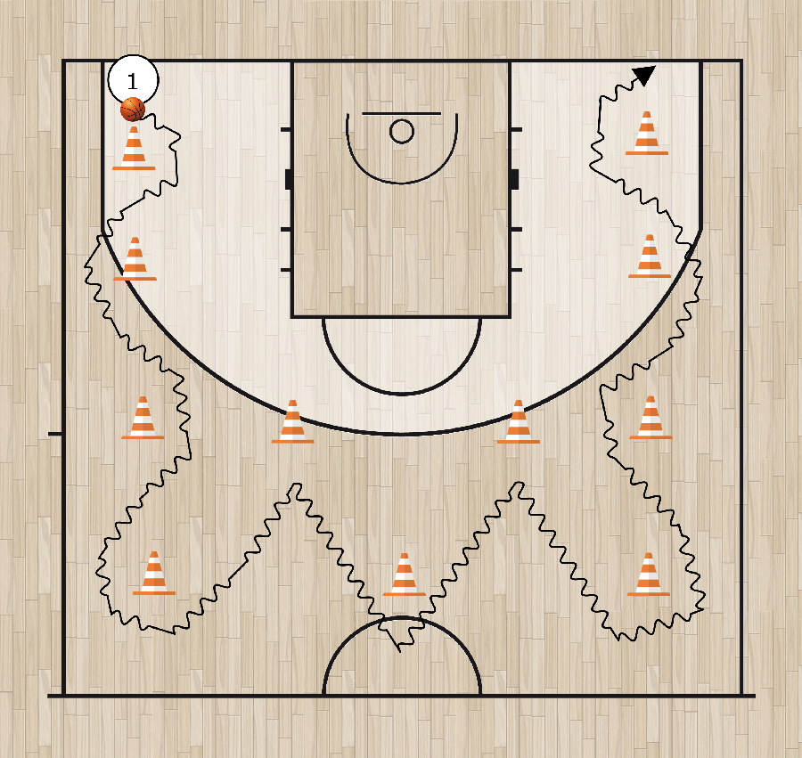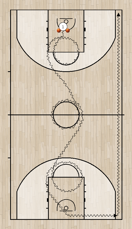 Palleggiare con cambi di direzione e cambio di mano. Sul lato sinistro del campo, cambio di mano sono sul gomito della linea di tiro libero, sulla fila di metà campo e sull'altra linea di tiro libero e si conclude con un tiro a canestro. Sul lato destro, cambio di mano sono più vicini e sono in numero maggiore. Alla fine, c’è sempre un tiro a canestro. Usiamo cambio di mano frontale, tra le gambe, dietro la schiena e giro in palleggio.