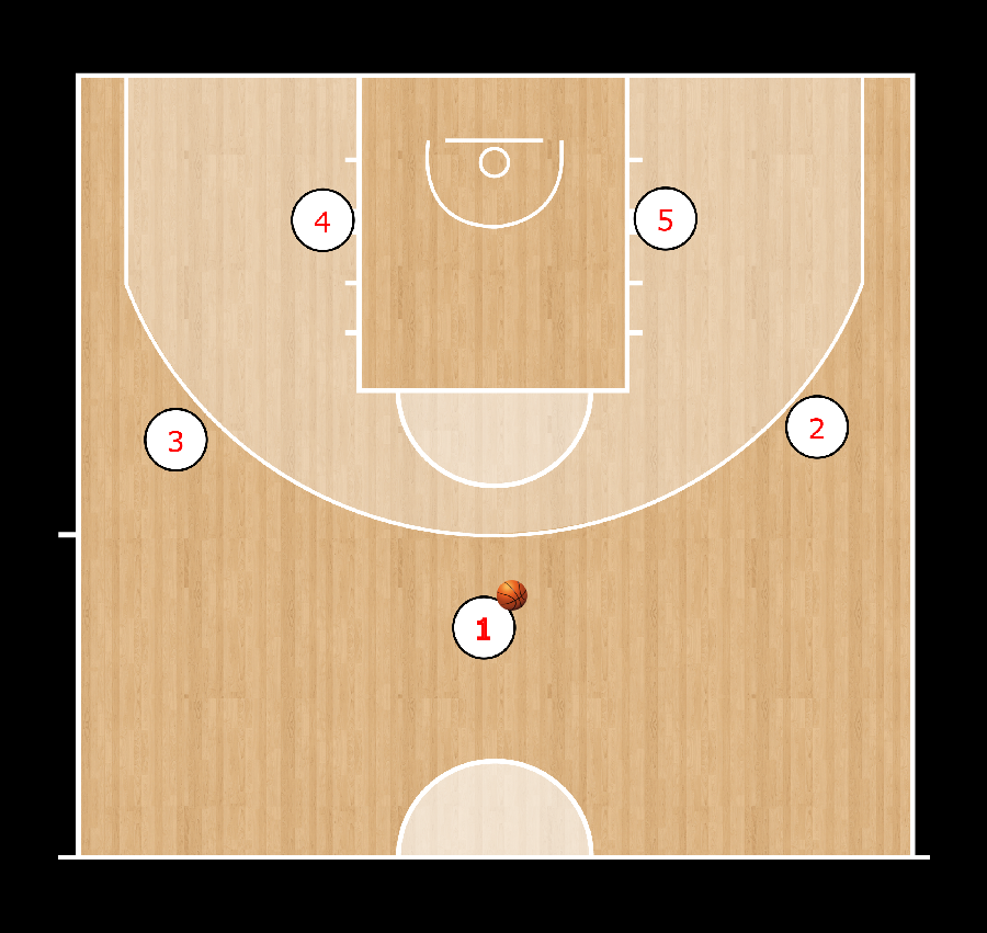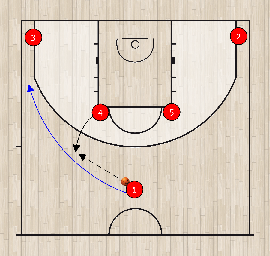 Azione in transizione della Nazionale USA. 1 va in palleggio per consegnare a 4 in angolo. 4 riceve palla e sale verso il centro passando a 5 in punta.
