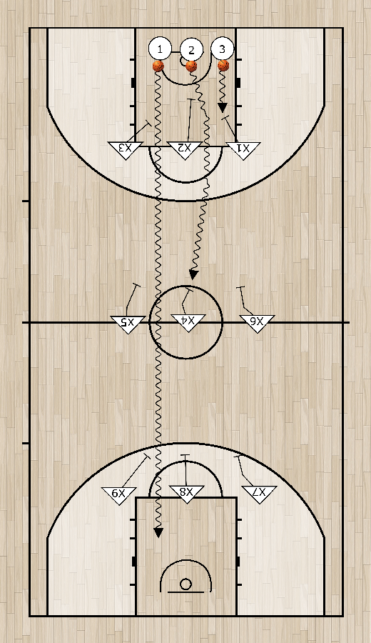 Il giocatore palleggia con due palloni attorno ai tre cerchi come nella figura. L'obiettivo è di tenere la testa alta in ogni momento guardando canestro che sta affrontando in quel momento. Dopo l'ultimo cerchio, i giocatori tornano in palleggio lungo la linea laterale.