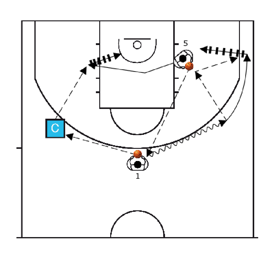 1 passa al coach, riceve da 5 e si sposta in palleggio per passare e ricevere sempre da 5 e concludere. 5 dopo il passaggio a1 taglia e riceve dal coach.